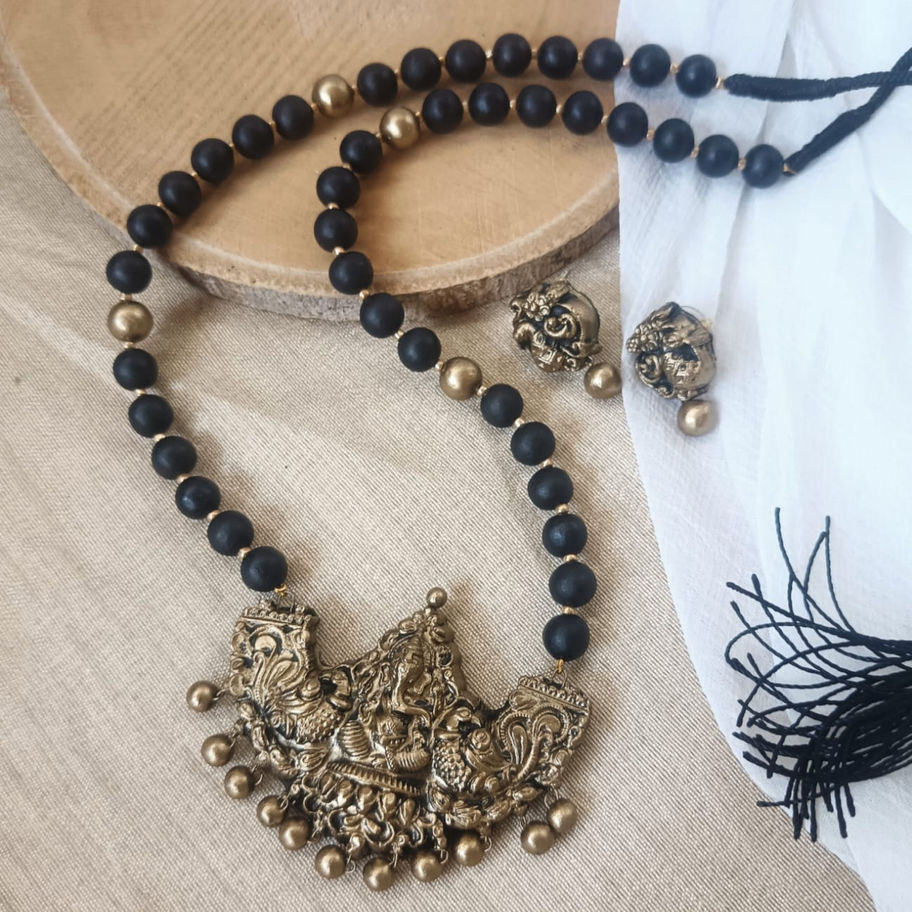 Enhance your traditional attire with Wriddhi's exquisite Gold Ganesh Terracotta Jewellery Set. This handmade set is perfect to add that extra shine to your traditional outfit, making it a splendid choice for festivals and functions.