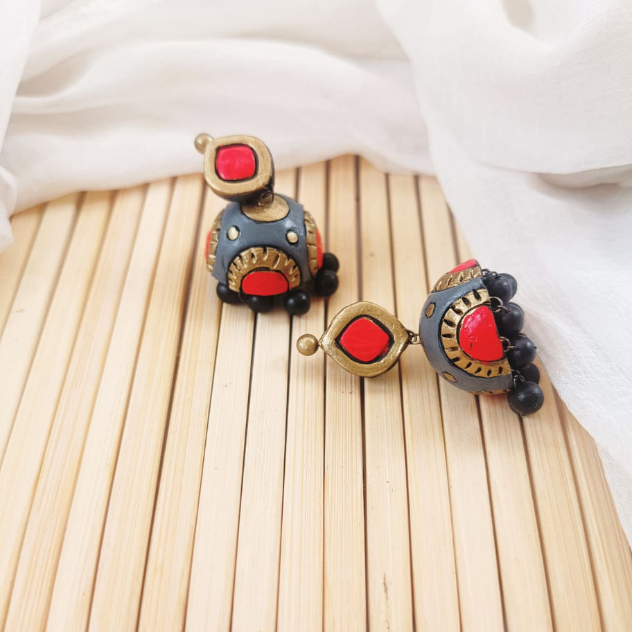 Elevate your ethnic look with these exquisite Grey & Red Terracotta Jhumkas from Wriddhi. Handmade with love, these earrings feature intricate traditional motifs with striking grey base highlighted by vibrant red accents and an elegant gold finish. Perfectly suited for pairing with kurtis and salwars, they seamlessly combine traditional charm with a contemporary flair.