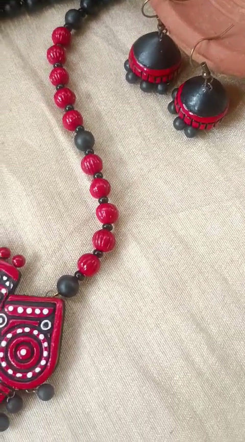This exquisite piece, featuring a stunning red colour combination, is handcrafted, embodying our commitment to authentic, high-quality craftsmanship. Perfect for adding a touch of traditional beauty to any outfit, our Kathakali Terracotta Jewellery is a true testament to the intricate artistry and dedication of our talented creators.