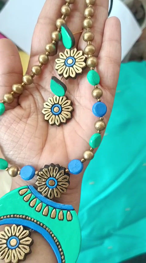 The Pale Emerald Gold Terracotta Jewellery Set from Wriddhi features a moon-inspired pendant and matching lightweight earrings. This set can be worn with lovely sarees and salwars, adding a touch of elegance to any outfit.