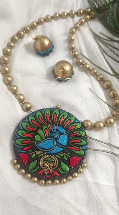 Discover the vibrant charm of the Peacock Blue & Green Terracotta Jewellery Set, exclusively at Wriddhi. This exquisite piece, adorned with a dash of red accents, seamlessly matches traditional outfits, ensuring you are festival or function-ready.