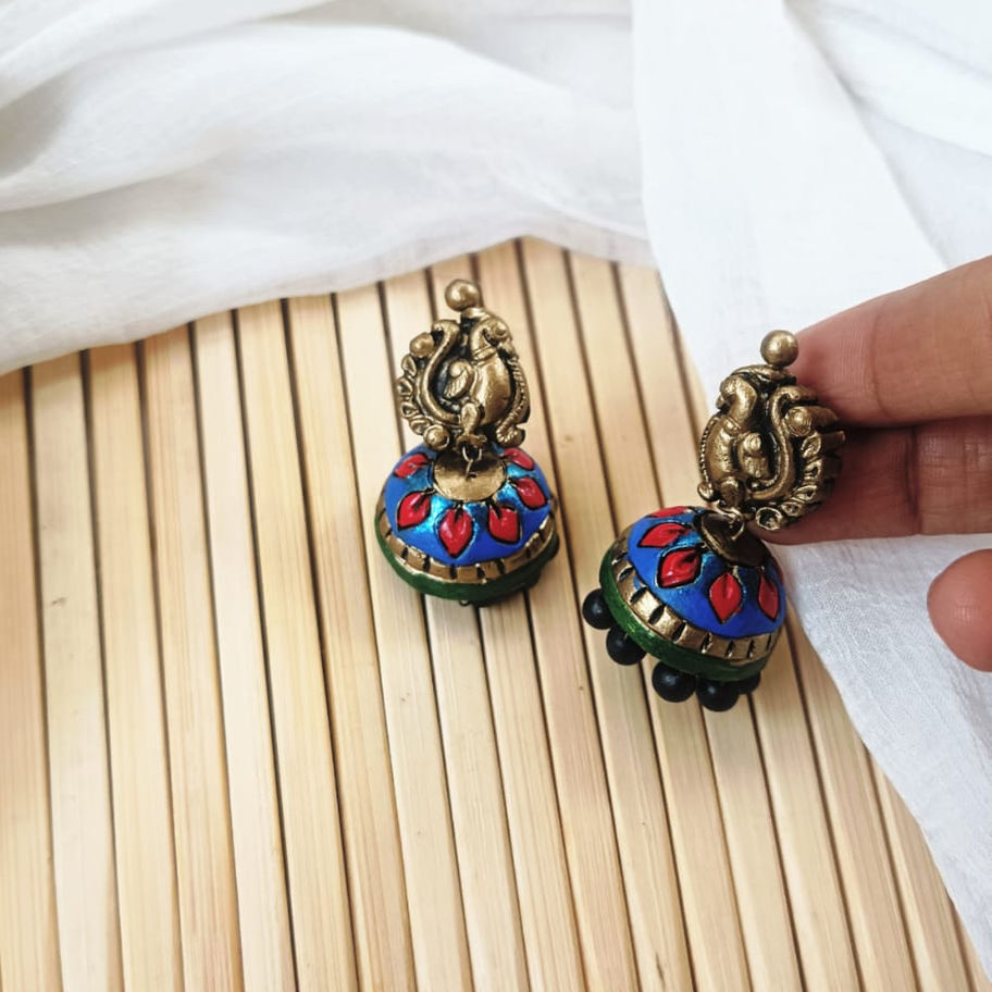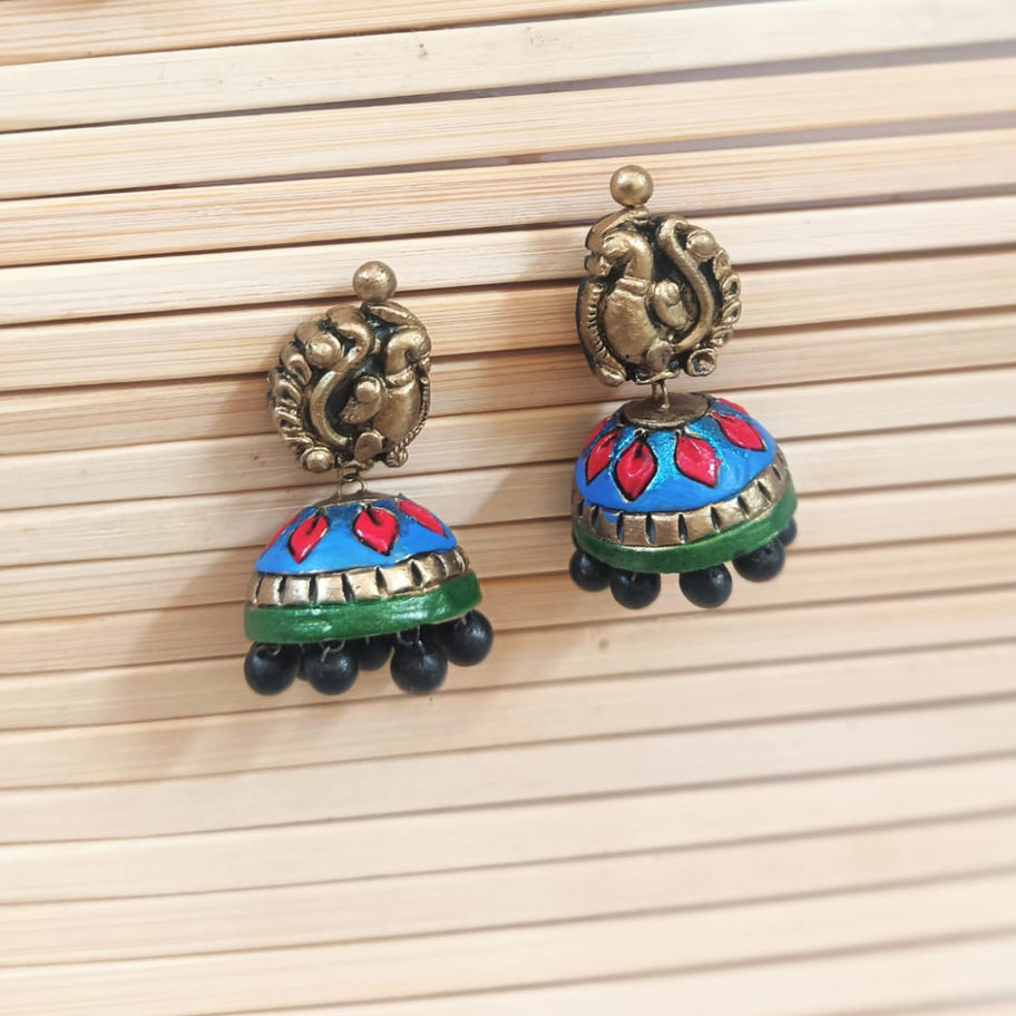 Discover the exquisite charm of our Peacock Blue Terracotta Jhumkas. Handmade with love, these jhumkas feature a harmonious blend of red, blue, and green accents with a delicate golden touch, enhancing their ethnic charm. Perfectly paired with kurtis and salwars, these earrings add a vibrant touch to your traditional look.